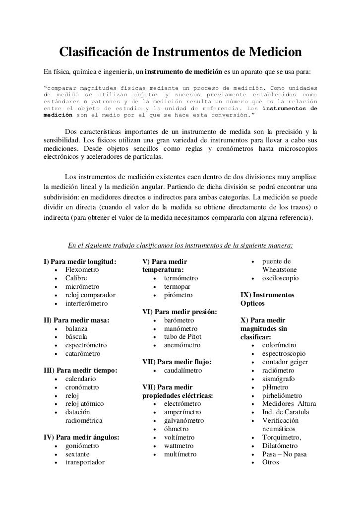 Clasificación de los instrumentos de medición. Existe una gran variedad de instrumentos de medición, por lo tanto se pueden clasificar de diferentes maneras ya sea por medición lineal y angular, medidores directos e indirectos, en este caso los vamos a clasificar según la magnitud física que evalúan.